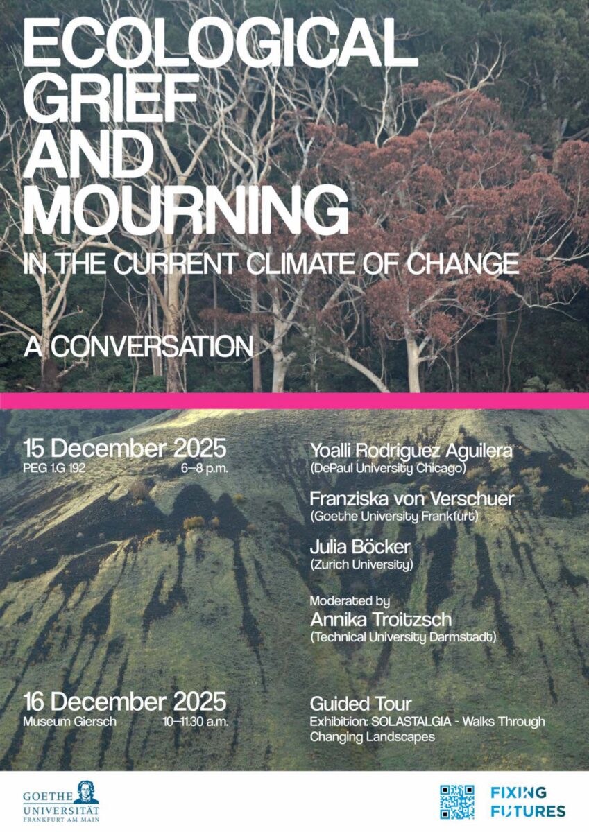 Climate change and other contemporary environmental challenges are shaking the foundations and certainties of previous ways and forms of life all around the globe. As an increasing number of studies show, these developments not only raise technical and political questions but also evoke a host of affective responses. One emerging phenomenon that this panel discussion focuses on is what scholars are now calling environmental or ecological grief. The conversation brings together three scholars whose empirical research explores different forms, sites, and practices of grief and mourning beyond the human. Through the anticipatory grief of foresters over dying forests, the grief and resistant mourning of Black or Indigenous communities facing the destruction of their homes and livelihoods, and artistic practices of mourning biocultural diversity loss, the panel explores what it means to feel, practice, and live with—as well as research and think with—ecological grief and mourning.