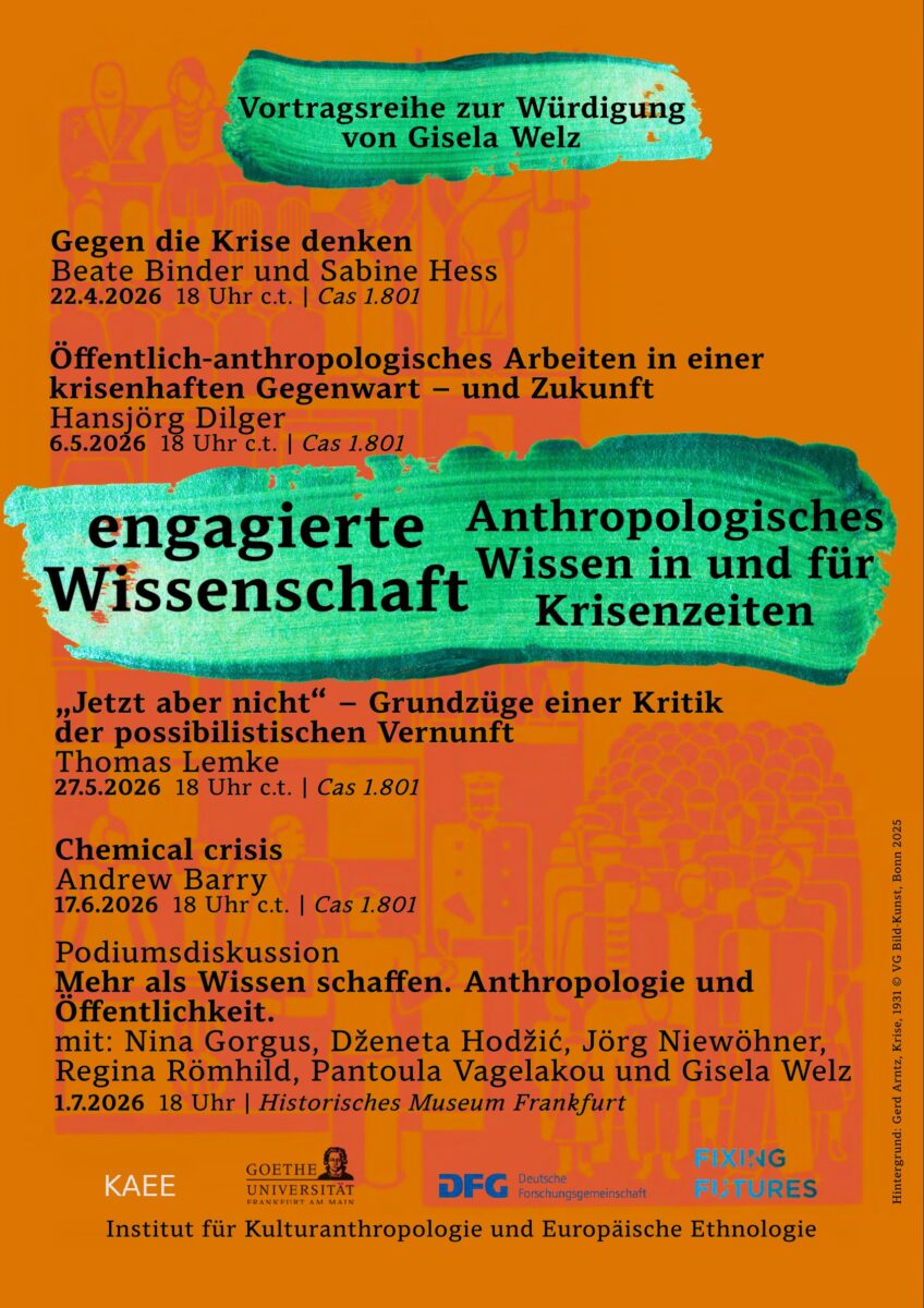 The Institute for Cultural Anthropology in cooperation with Fixing Futures has organized a lecture series to honor Gisela Welz‘ years-long dedication to the social sciences, cultural anthropology and the RTG.